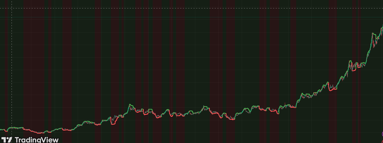 The Supertrend dynamically follows these envelope levels, acting as a volatility-aware trailing guide